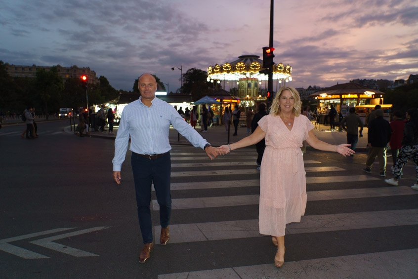 Photo de couple devant le Carrousel de la Tour Eiffel.
