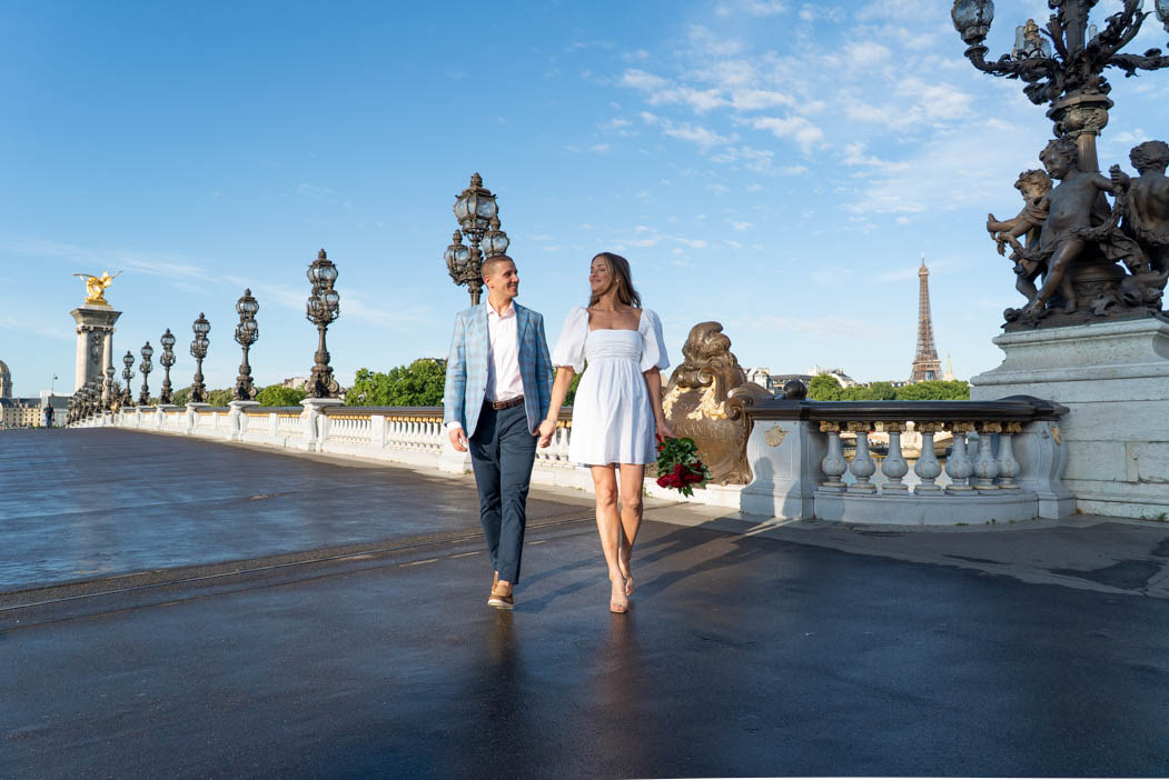 As their photographer in Paris, I made sure to tailor the photoshoot to capture a variety of romantic and joyful moments. Whether it was a tender kiss in front of the Eiffel Tower or an elegant stroll across the bridge, I ensured their love story was beautifully told through every shot.
